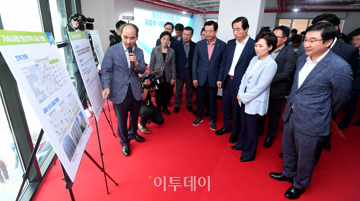 김현미 국토교통부 장관이 21일 서울 서대문구 대현동 기숙사형청년주택에서 열린 ‘청년주거지원을 위한 국토부-서울시 구청장 간담회’에서 서울시 구청장들과 함께 청년 주거지원계획 브리핑을 듣고 있다.