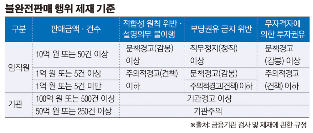 제재 기준은 불완전하게 판매된 금액 또는 건수 중 중한 순으로 적용된다. 임직원의 경우 판매금액·건수가 10억원 또는 50건 이상일 경우 위반 유형에 따라 문책경고(감봉) 혹은 직무정지(정직)를 받게된다. 기관의 경우 100억 원 또는 500건 이상 판매했을 시 기관경고 이상을 받는다.