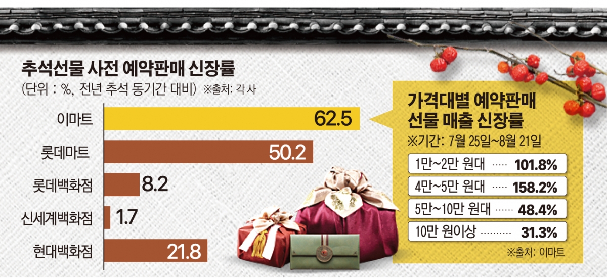 이마트는 지난달 25일부터 이달 20일까지 추석 선물세트 사전 예약을 받은 결과 작년 추석 동기간 (2018년 8월 7일~9월 2일)보다 62.5% 증가했다고 22일 밝혔다. 과일 세트(40.7%)와 수산세트(39.5%) 매출이 크게 늘었고, 냉장 한우 구이용 선물세트 매출 신장률은 35.9%를 기록했다. 또한, 전통적인 인기 선물세트인 조미료, 통조림 선물세트 매출이 각각 40.1%, 46.2% 증가했다. 지속해서 인기가 상승하는 와인 세트도 38.2% 신장했으며, 지난해 판매가 주춤했던 커피음료와 생활용품 세트는 각각 135.6%, 400.1% 신장하며 회복세를 되찾았다.