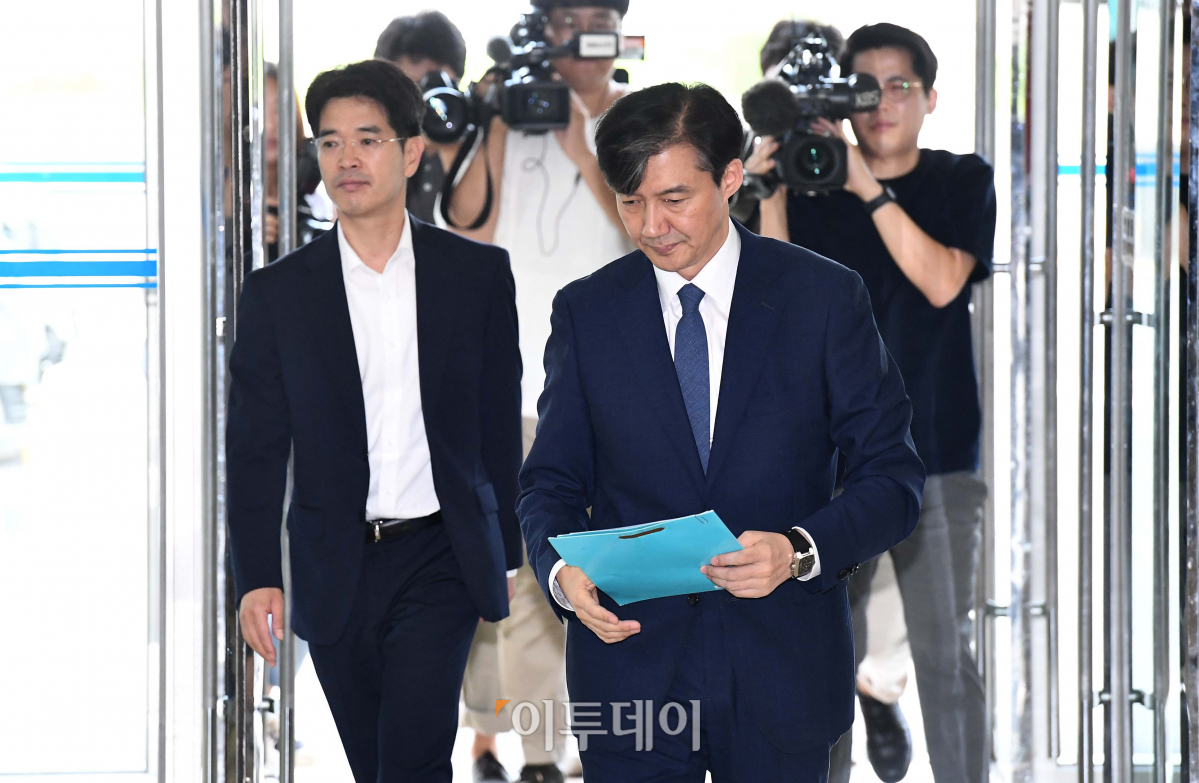 조국 법무부 장관 후보자가 25일 인사청문회 준비 사무실이 마련된 서울 종로구 적선현대빌딩으로 출근하고 있다.