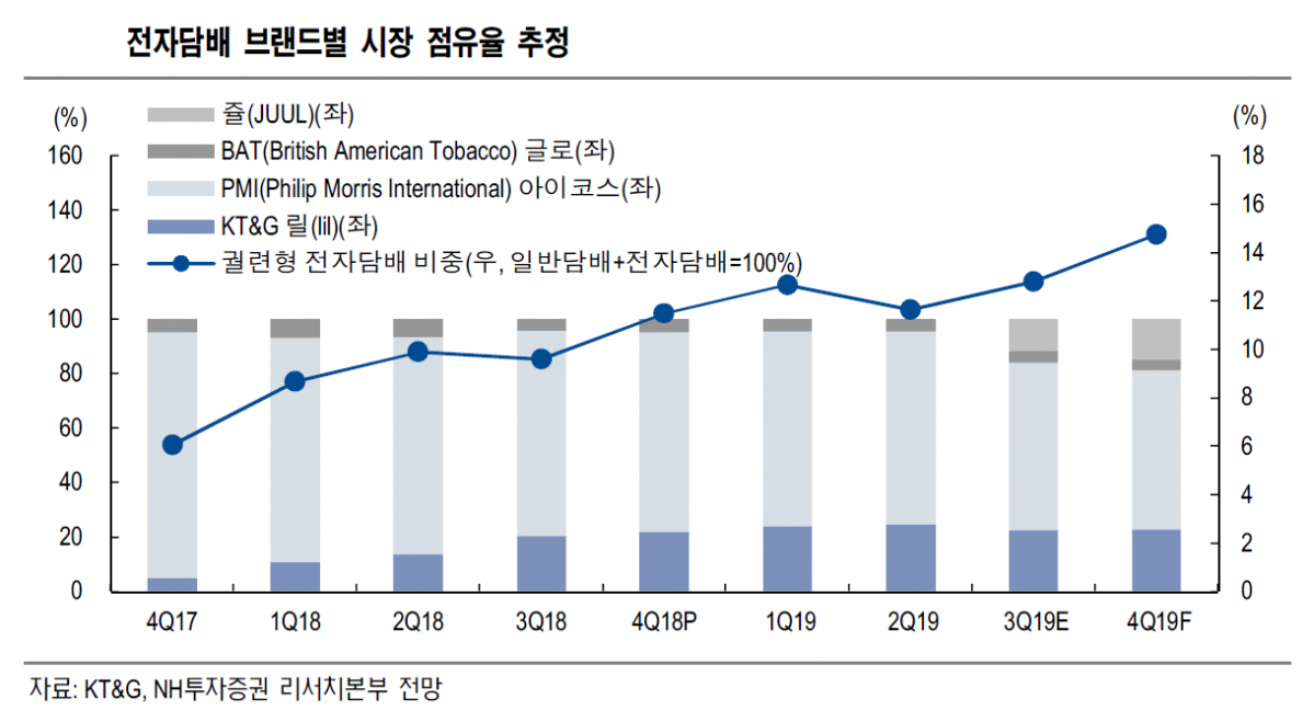 또한 “국내의 경우 전자담배 시장에서의 점유율이 30% 이상으로 확대될 것”이라며 “매출액은 전년 대비 5.1% 증가하고 영업이익률은 40%대를 유지할 것으로 예상한다”고 전했다.