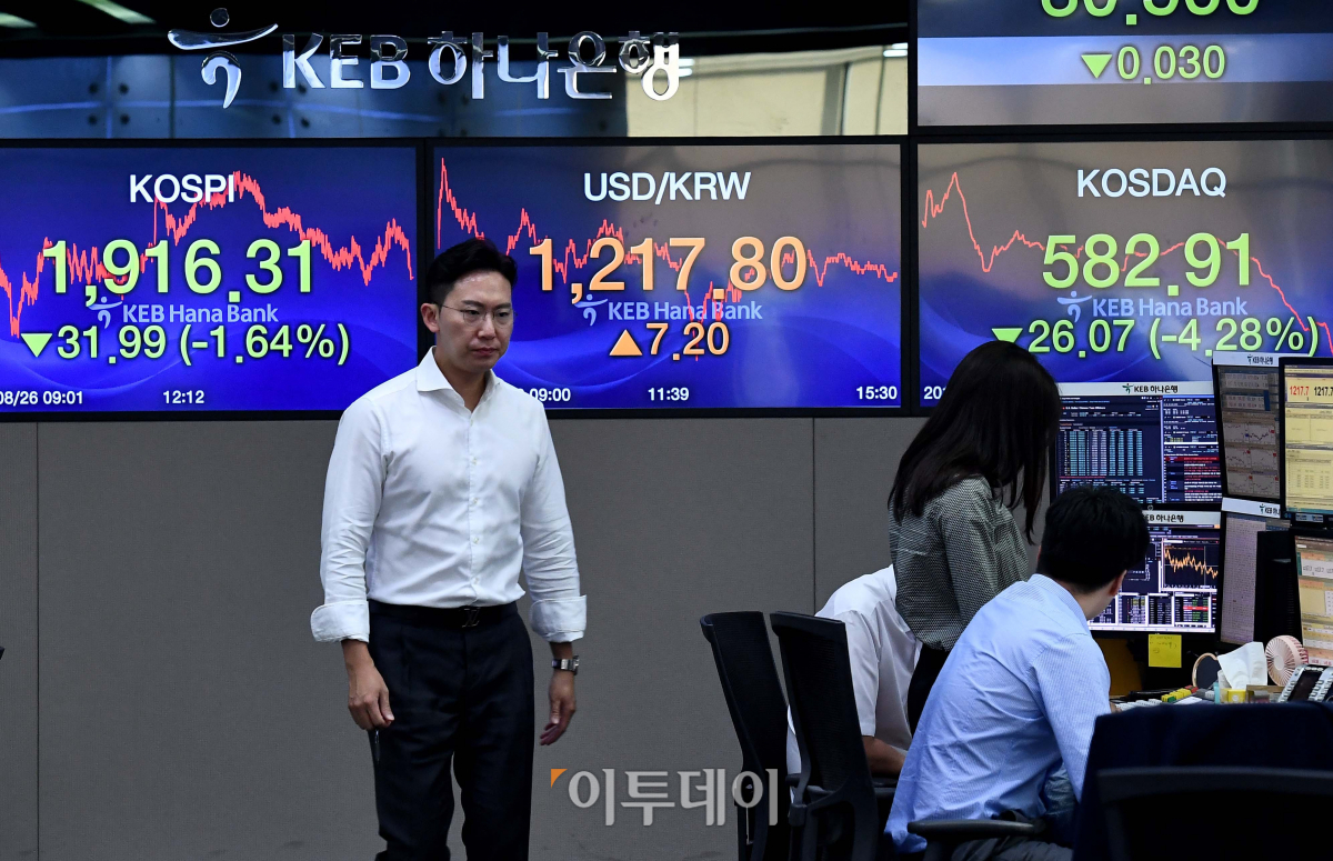 미·중 무역전쟁 여파 등으로 코스피와 코스닥이 하락 마감한 26일 오후 서울 중구 KEB하나은행 딜링룸 전광판에 코스피지수가 전 거래일보다 31.99포인트(1.64%) 내린 1916.31을 코스닥지수가 26.07포인트(4.28%) 내린 582.91을 가리키고 있다.