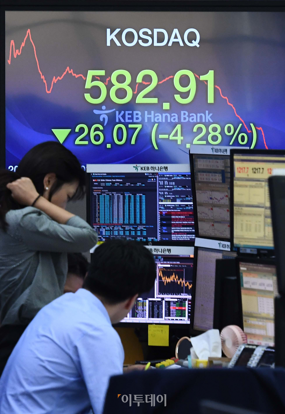 미·중 무역전쟁 여파 등으로 코스피와 코스닥이 동반 하락 마감한 26일 오후 서울 중구 KEB하나은행 딜링룸 전광판에 코스닥지수가 26.07포인트(4.28%) 내린 582.91을 가리키고 있다.