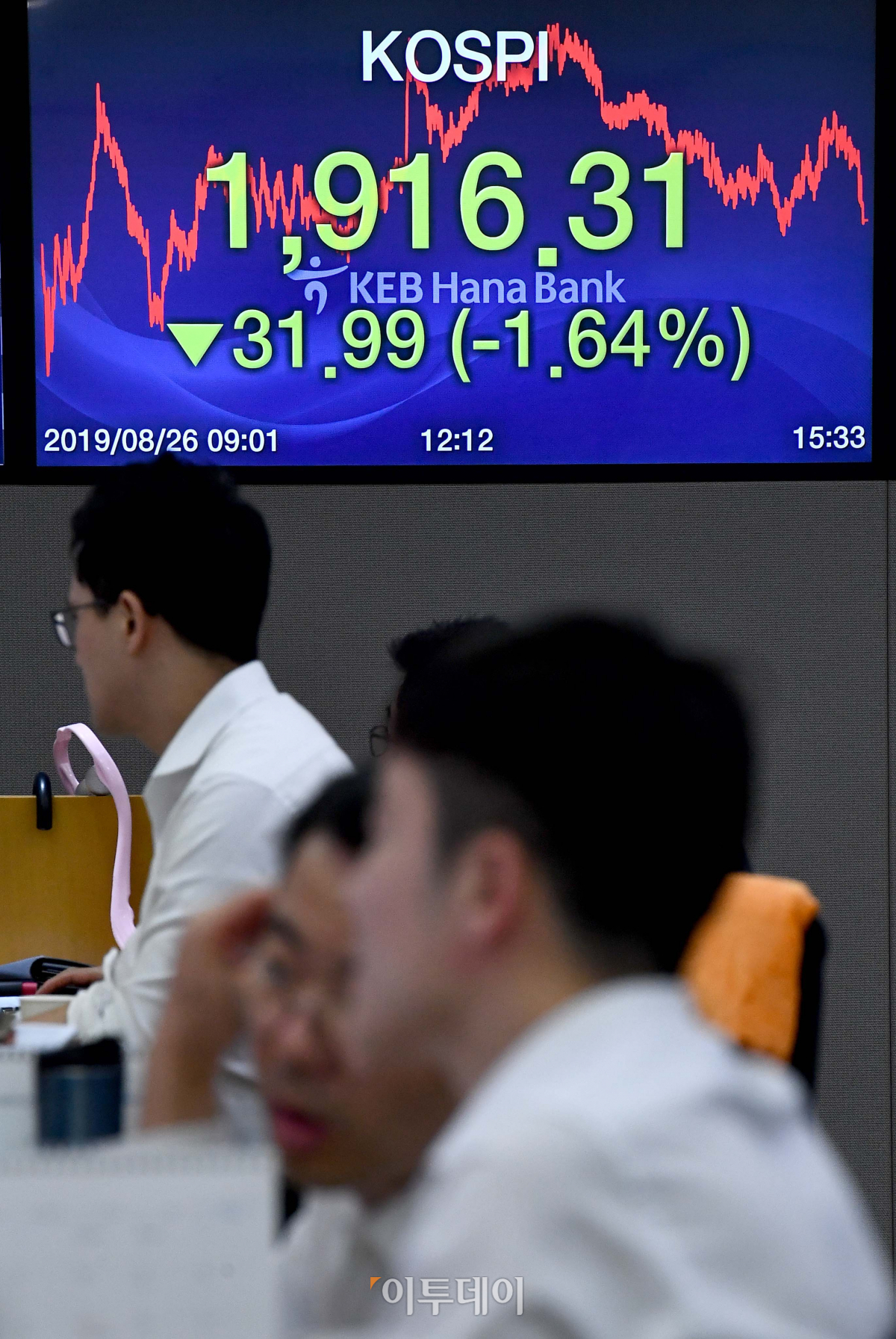 미·중 무역전쟁 여파 등으로 코스피와 코스닥이 하락 마감한 26일 오후 서울 중구 KEB하나은행 딜링룸 전광판에 코스피지수가 전 거래일보다 31.99포인트(1.64%) 내린 1916.31을 가리키고 있다.