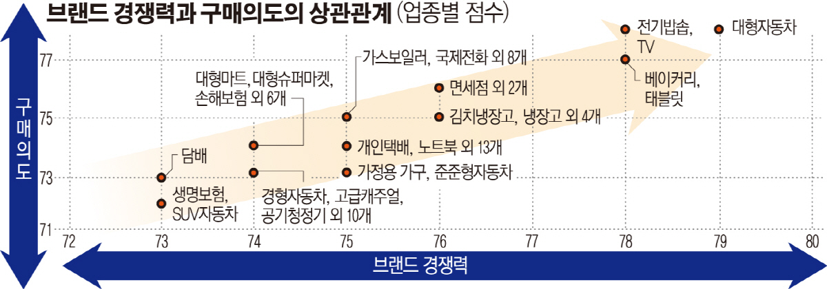 대부분 업종에서 브랜드 경쟁력이 높아질수록 구매 의도 점수도 높아지는 것으로 분석됐다. 브랜드 경쟁력과 구매 의도가 높은 업종은 소비자가 생각하기에 해당 업종 내 브랜드의 경쟁력이 높고, 그에 따라 실제 구매 의도도 높다는 뜻이다.