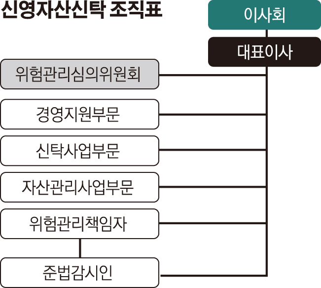 신영자산신탁은 55여 명의 인력으로 업무를 시작할 예정이다. 이 중 주주사의 인력은 10여 명인 것으로 알려졌다. 박순문 대표이사 산하에 사업 부문은 신탁사업 부문과 자산관리사업 부문으로 나눠 운영한다. 앞서 예비인가 당시 신영자산신탁은 기존 신탁사업 노하우에 부동산 서비스를 결합한 종합자산관리 플랫폼을 구축하겠다고 밝혔기에, 기존 업계와 차별화된 자산관리사업 부문 조직을 만들어 운영한다는 계획이다.