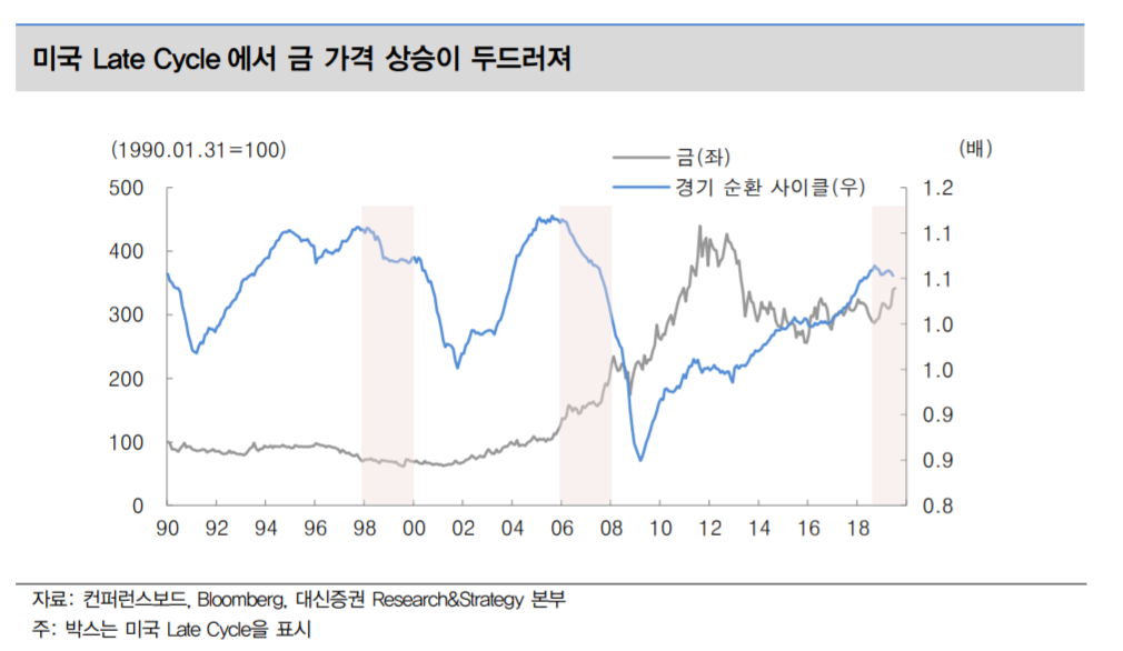 김 연구원은 “과거 미국 경기순환 사이클상 정점을 찍은 직후(Late Cycle)의 금 가격 상승분을 고려했을 때 향후 금 가격은 추가 상승이 가능할 것”이라고 설명했다.