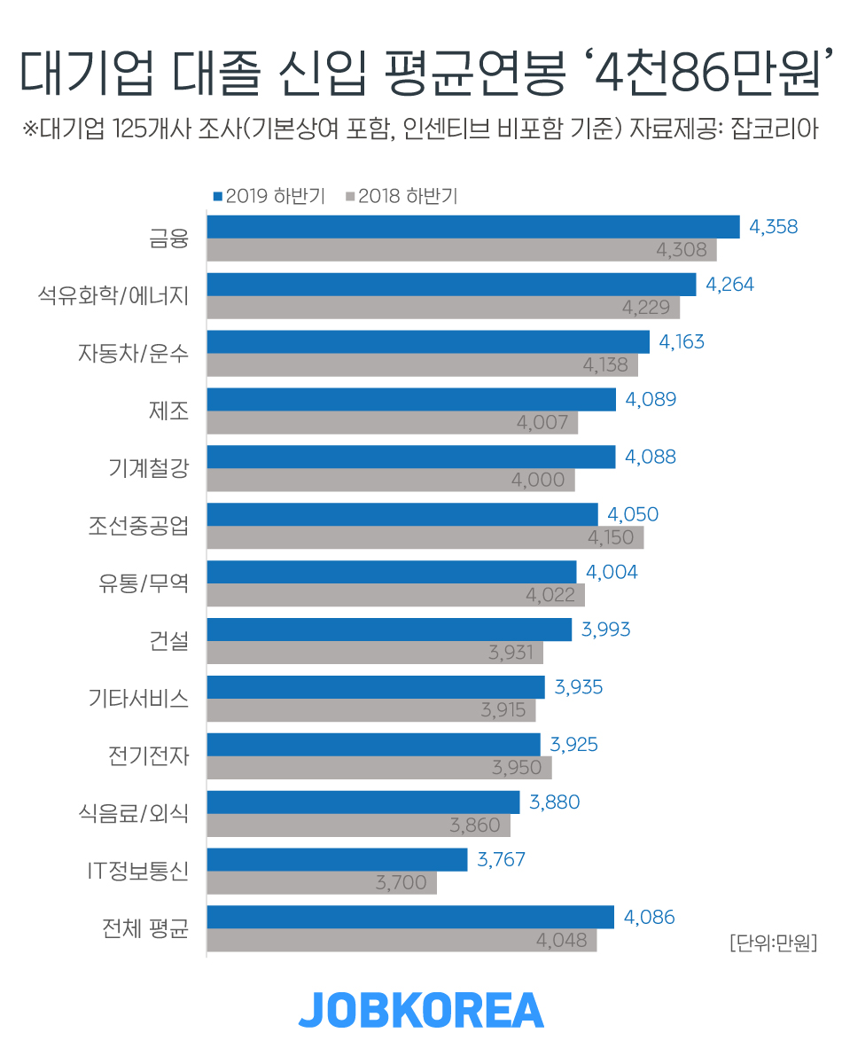 취업포털 잡코리아가 올해 하반기 신입직 초임을 밝힌 대기업 125개사의 대졸 신입직 평균연봉을 집계했다. 이번 조사는 4년 대졸자 기준으로 기본상여금 포함, 인센티브 비포함 기준으로 조사했다.