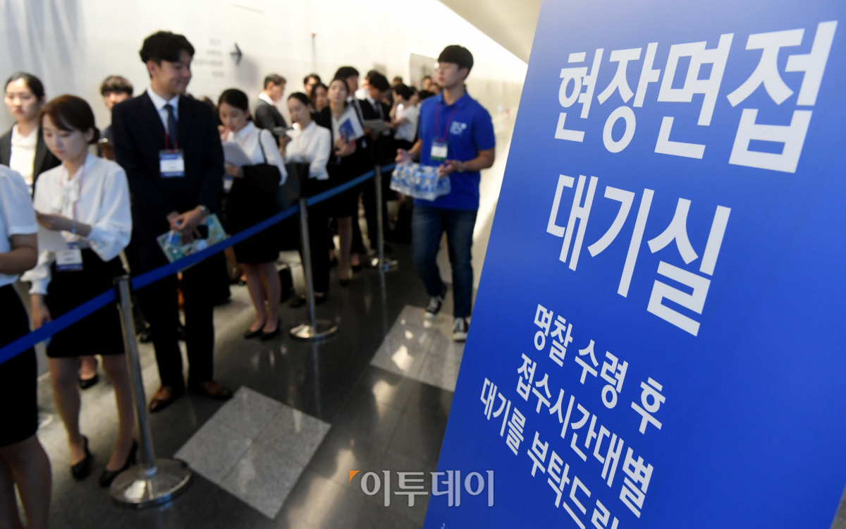 27일 서울 중구 을지로 동대문디자인플라자(DDP)에서 열린 ‘금융권 공동채용박람회’에서 구직자들이 현장면접을 보기 위해 대기하고 있다. 은행연합회 등 6개 금융협회 주최로 28일까지 열리는 이번 채용박람회엔 60개 금융회사가 참여해 현장면접과 채용상담 등을 진행한다.