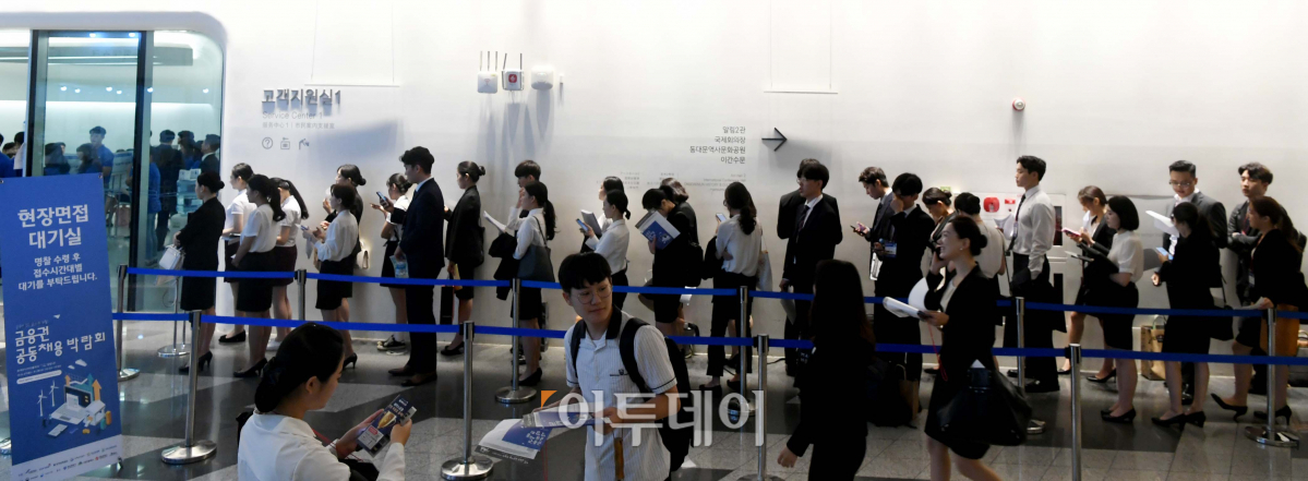 27일 서울 중구 을지로 동대문디자인플라자(DDP)에서 열린 ‘금융권 공동채용박람회’에서 구직자들이 현장면접을 보기 위해 대기하고 있다. 은행연합회 등 6개 금융협회 주최로 28일까지 열리는 이번 채용박람회엔 60개 금융회사가 참여해 현장면접과 채용상담 등을 진행한다.