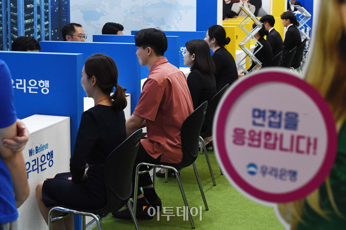 27일 서울 중구 을지로 동대문디자인플라자(DDP)에서 열린 ‘금융권 공동채용박람회’에서 구직자들이 현장면접을 보고 있다. 은행연합회 등 6개 금융협회 주최로 28일까지 열리는 이번 채용박람회엔 60개 금융회사가 참여해 현장면접과 채용상담 등을 진행한다.