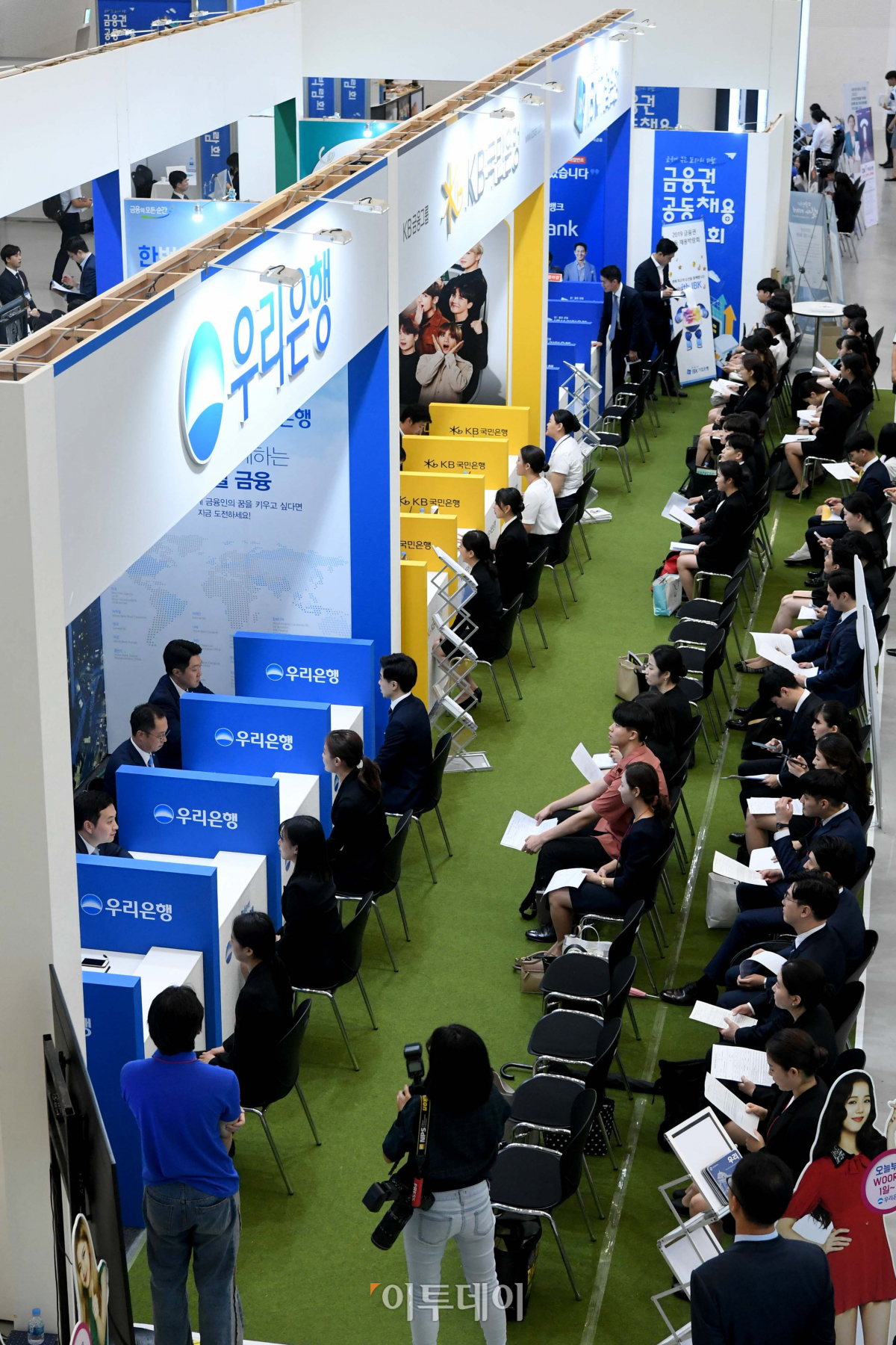 27일 서울 중구 을지로 동대문디자인플라자(DDP)에서 열린 ‘금융권 공동채용박람회’에서 구직자들이 현장면접을 보고 있다. 은행연합회 등 6개 금융협회 주최로 28일까지 열리는 이번 채용박람회엔 60개 금융회사가 참여해 현장면접과 채용상담 등을 진행한다.