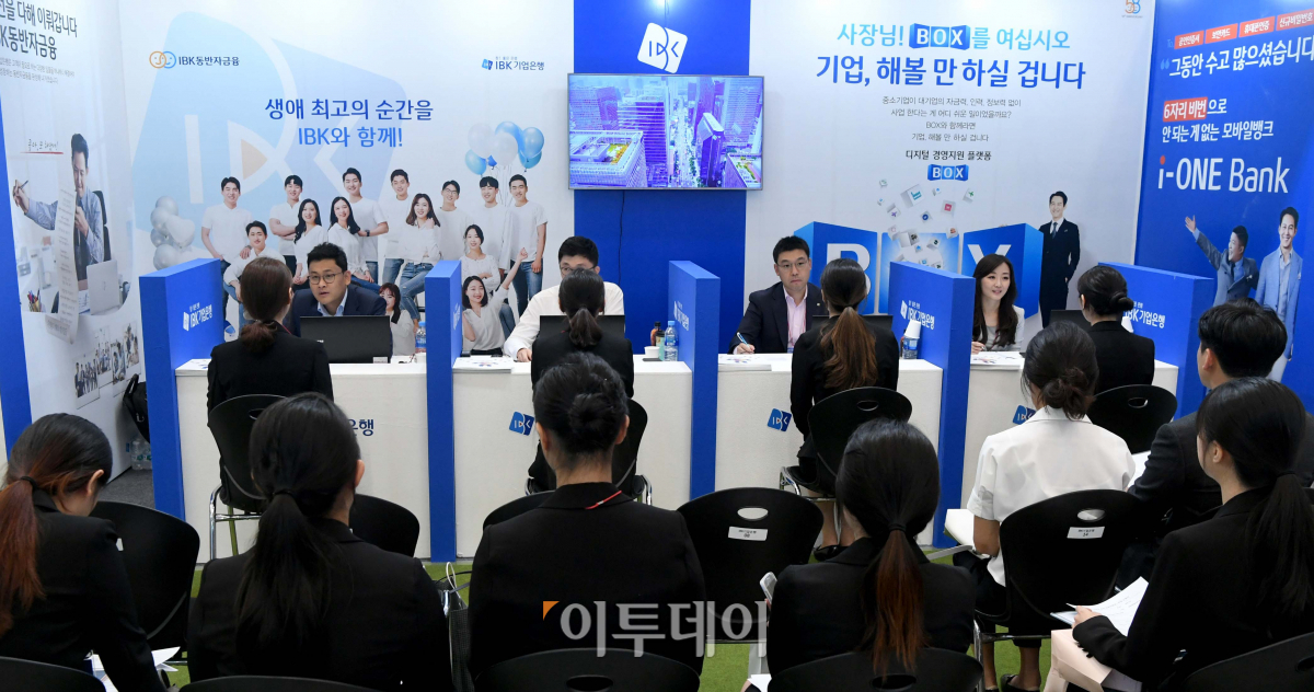 27일 서울 중구 을지로 동대문디자인플라자(DDP)에서 열린 ‘금융권 공동채용박람회’에서 구직자들이 현장면접을 보고 있다. 은행연합회 등 6개 금융협회 주최로 28일까지 열리는 이번 채용박람회엔 60개 금융회사가 참여해 현장면접과 채용상담 등을 진행한다.