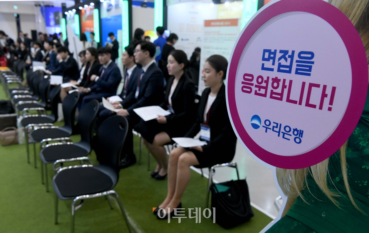 27일 서울 중구 을지로 동대문디자인플라자(DDP)에서 열린 ‘금융권 공동채용박람회’에서 구직자들이 현장면접을 보기 위해 기다리고 있다. 은행연합회 등 6개 금융협회 주최로 28일까지 열리는 이번 채용박람회엔 60개 금융회사가 참여해 현장면접과 채용상담 등을 진행한다.