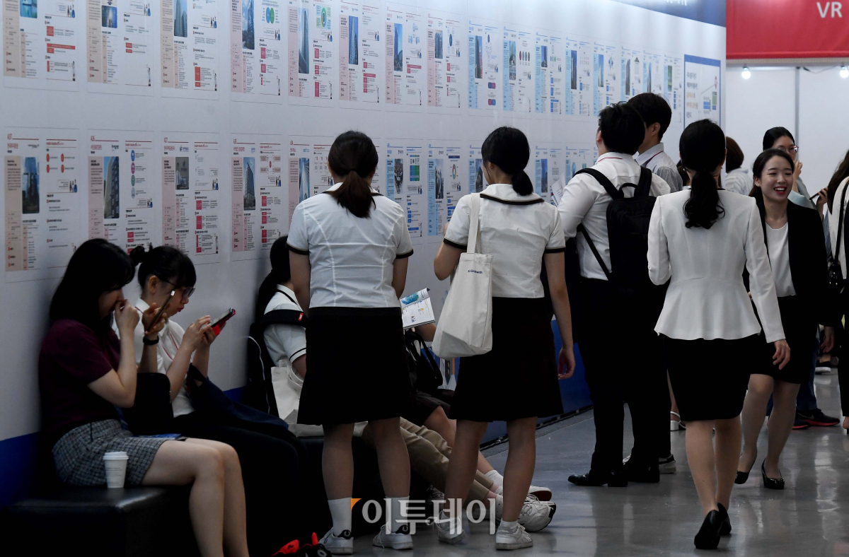 27일 서울 중구 을지로 동대문디자인플라자(DDP)에서 열린 ‘금융권 공동채용박람회’에서 구직자들이 채용공고 게시판을 살펴보고 있다. 은행연합회 등 6개 금융협회 주최로 28일까지 열리는 이번 채용박람회엔 60개 금융회사가 참여해 현장면접과 채용상담 등을 진행한다.