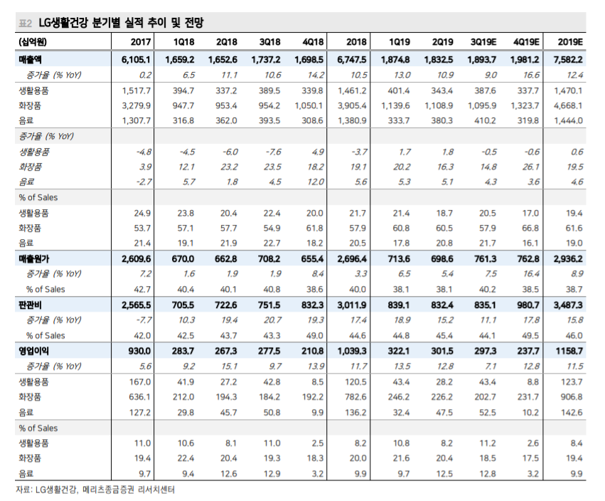 양지혜 메리츠종금증권 연구원은 LG생활건강의 3분기 실적으로 “매출액은 지난해 같은 기간보다 9% 증가한 1조8900억 원, 영업이익은 7.1% 오른 2973억 원을 예상한다”고 말했다.