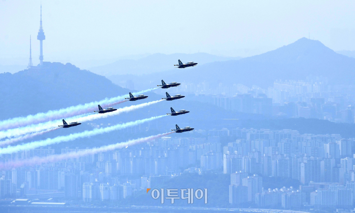 공군 ‘블랙이글스’ 특수비행팀이 28일 서울 송파구 잠실 일대에서 서울국제휠체어마라톤대회 축하공연 예행연습을 펼치고 있다.