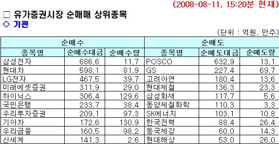 11일 오후 3시 20분 잠정집계 결과 기관은 특별한 종목이나 업종에 주목하기 보단 지수등락에 따라 매수·매도를 한 것으로 나타났다.