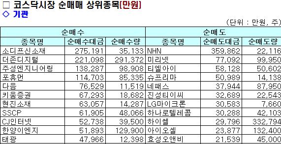 코스닥시장에서는 소디프신소재 27억원, 더존디지털 22억원, 주성엔지니어렁 13억원, 포휴먼 11억원 순으로 순매수세를 보였고 NHN 35억원, 미리넷 7억원, 티엘아이 5억원, 슈프리마 5억원 순으로 순매도세를 보였다.