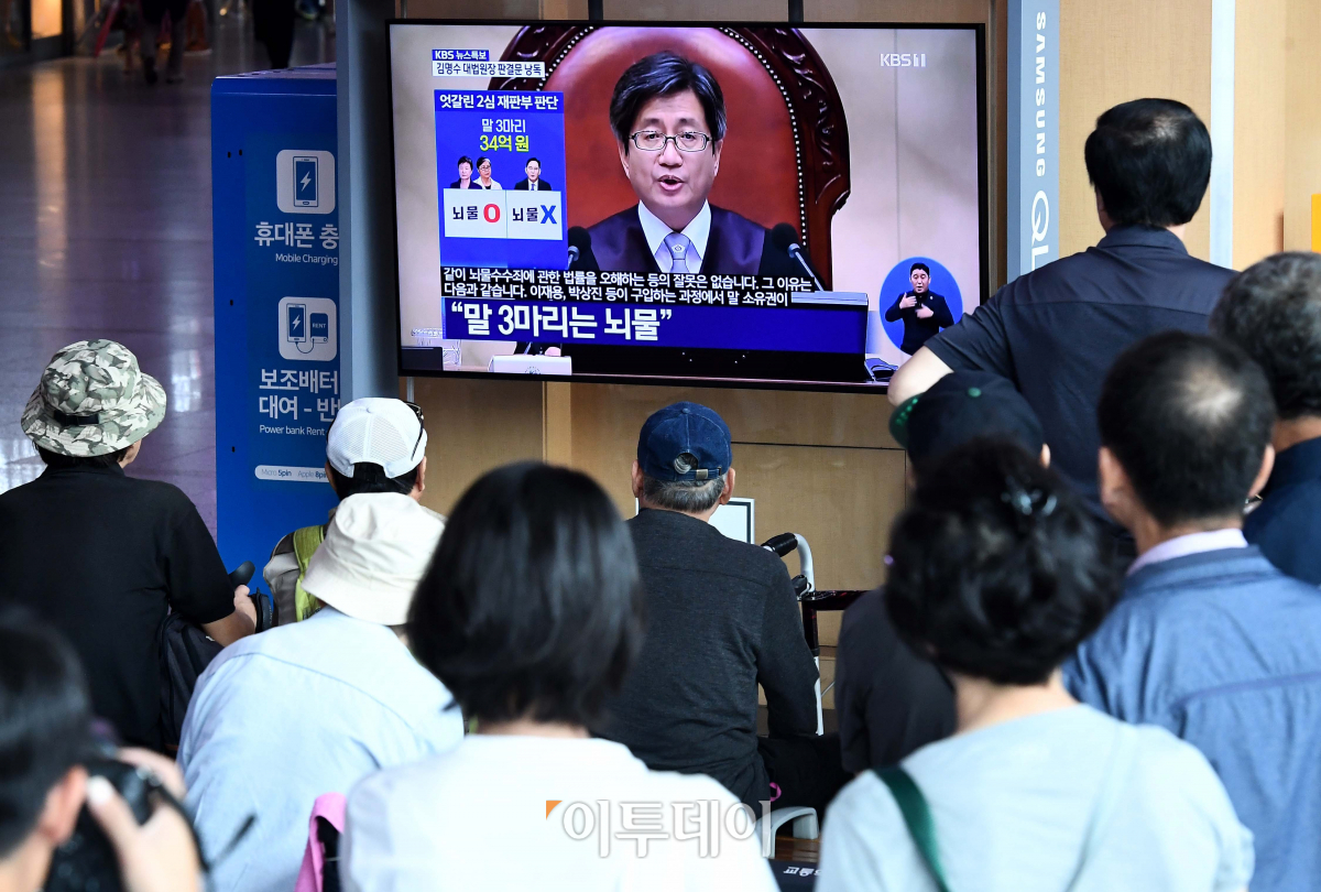 29일 서울 용산구 한강대로 서울역에서 시민들이 박근혜 전 대통령과 이재용 삼성전자 부회장, 최순실씨 관련 ‘국정농단 사건’ 상고심 선고 공판 TV 생중계를 지켜보고 있다.