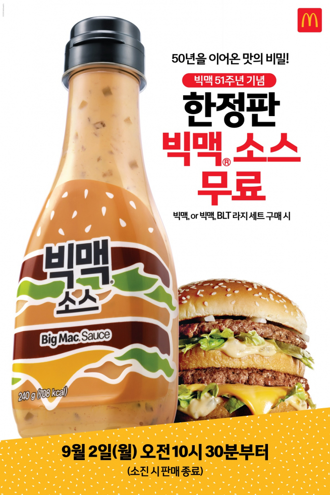 맥도날드는 빅맥 출시 51주년을 기념해 2일 오전 10시 30분부터 전국 레스토랑에서 빅맥 또는 빅맥 BLT 라지 세트를 구매한 고객에게 한정판 ‘빅맥 소스’를 1병(240ml)씩 선착순 무료 제공한다.