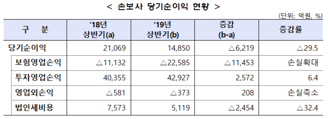 2일 금융감독원이 발표한 자료에 따르면 손해보함사의 올해 상반기 당기순이익은 1조4850억 원으로, 장기·자동차보험의 영업손실 확대 등으로 전년 동기 대비 29.5%(6219억 원) 감소했다.