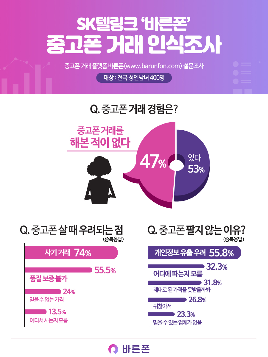 SK텔링크는 자사 중고폰 거래 전문 플랫폼 '바른폰'이 오픈서베이를 통해 전국 성인남녀 400명을 대상으로 설문 조사한 결과 응답자의 46.8%가 중고폰 거래를 해본 적이 없다고 답했다고 2일 밝혔다.