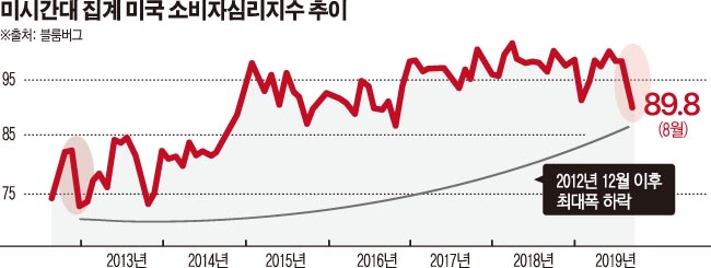 미시간대가 지난달 30일 발표한 미국의 8월 소비자심리지수 확정치는 89.8로 전월의 98.4에서 하락하며 2016년 10월 이후 거의 3년 만의 최저치를 기록했다. 또 하락폭은 지난 2012년 12월 이후 가장 컸다.