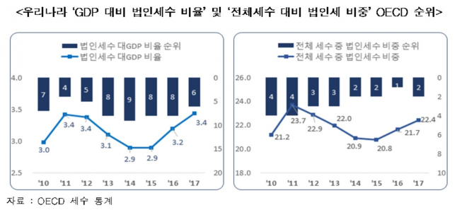 한국의 GDP대비 법인세수 비율 OECD 순위는 2010년 7위였으나 2014년 9위를 기록하며 낮아지는 추세였으나, 2015년부터 재상승하며 2017년 6위까지 올라왔다.