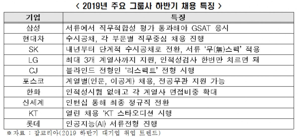 현대자동차는 수시공채로 전환해 각 부문별 직무중심 채용을 진행하며 SK도 내년부터 단계적 수시 공채로 전환해 서류에 무(無)스펙을 적용한다. LG는 최대 3개 계열사까지 지원이 가능하되 인적성검사는 한번만 치르면 된다.