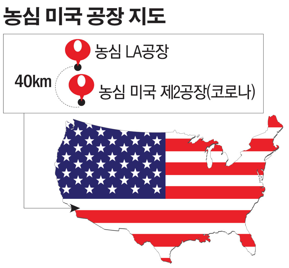 농심은 미국 신공장 부지를 캘리포니아주 LA인근 코로나로 결정했다고 3일 밝혔다. 내년 초 공사를 시작해 기존 공장의 3배 규모인 약 15만4000㎡(4만6500평) 부지에 지을 계획이다. 공장 건설에 투입하는 금액은 총 2억 달러로 농심 창립 이래 최대 규모다.