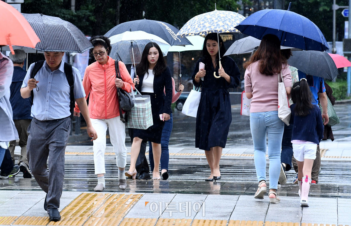 가을 장마전선의 영향으로 서울을 비롯한 전국에 비가 내린 4일 서울 종로구 광화문사거리에서 우산을 쓴 시민들이 발걸음을 옮기고 있다.