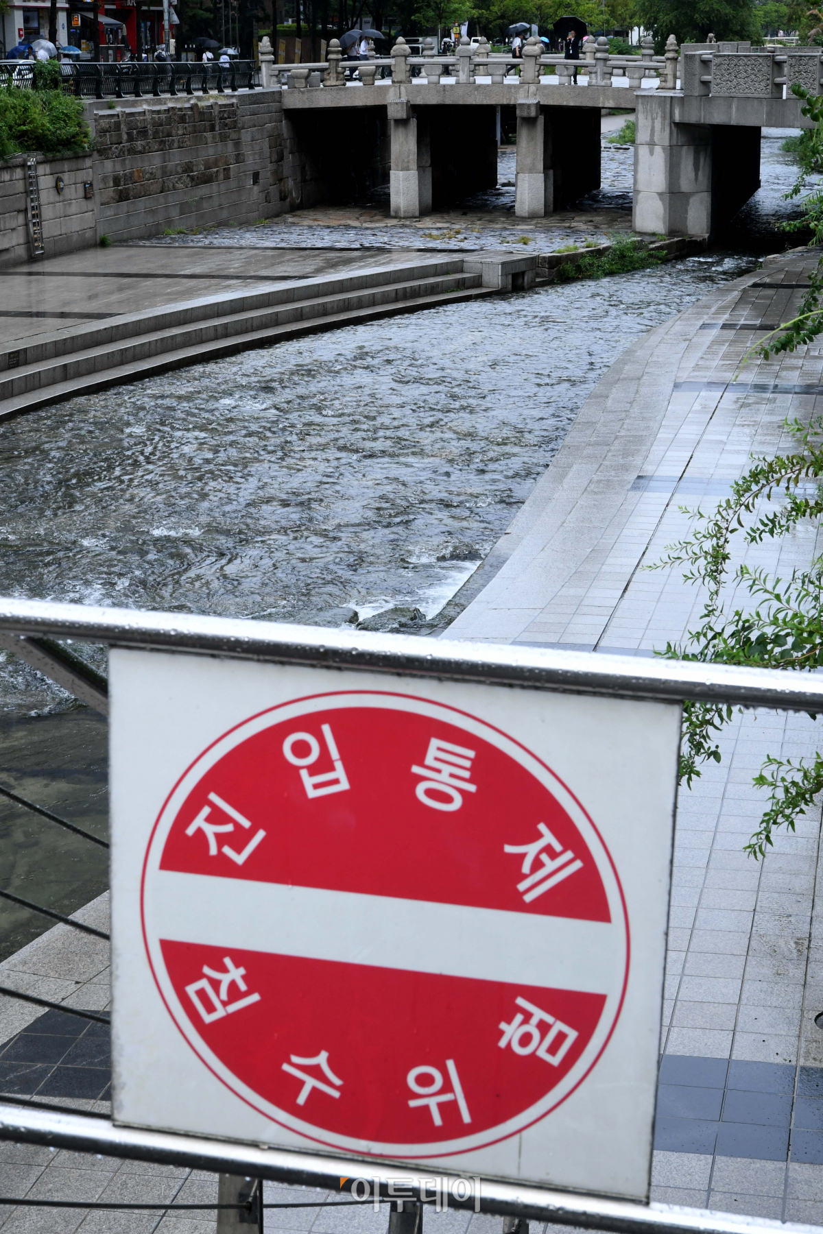 가을 장마전선의 영향으로 서울을 비롯한 전국에 비가 내린 4일 서울 종로구 청계천 산책로의 출입이 통제되고 있다.