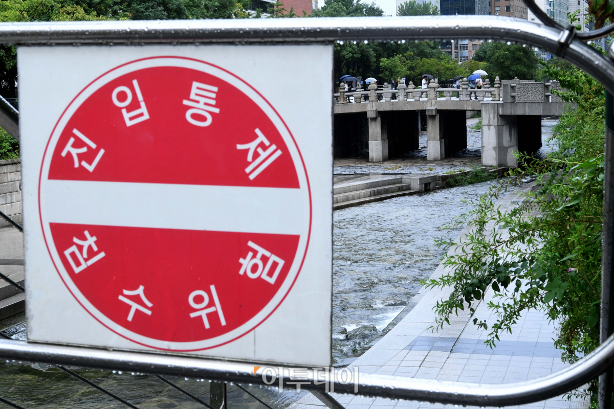 가을 장마전선의 영향으로 서울을 비롯한 전국에 비가 내린 4일 서울 종로구 청계천 산책로의 출입이 통제되고 있다.