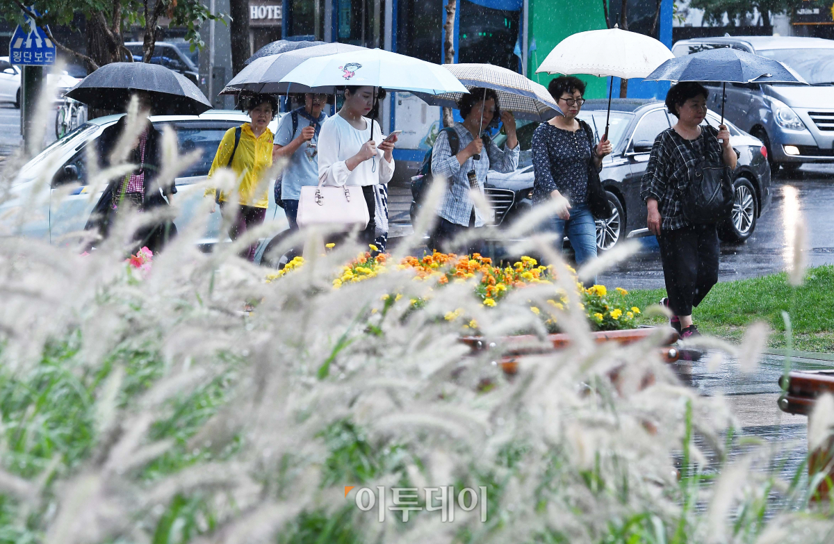 가을 장마전선의 영향으로 서울을 비롯한 전국에 비가 내린 4일 서울 종로구 청계광장의 수크령 군락 사이로 우산을 쓴 시민들이 발걸음을 옮기고 있다.