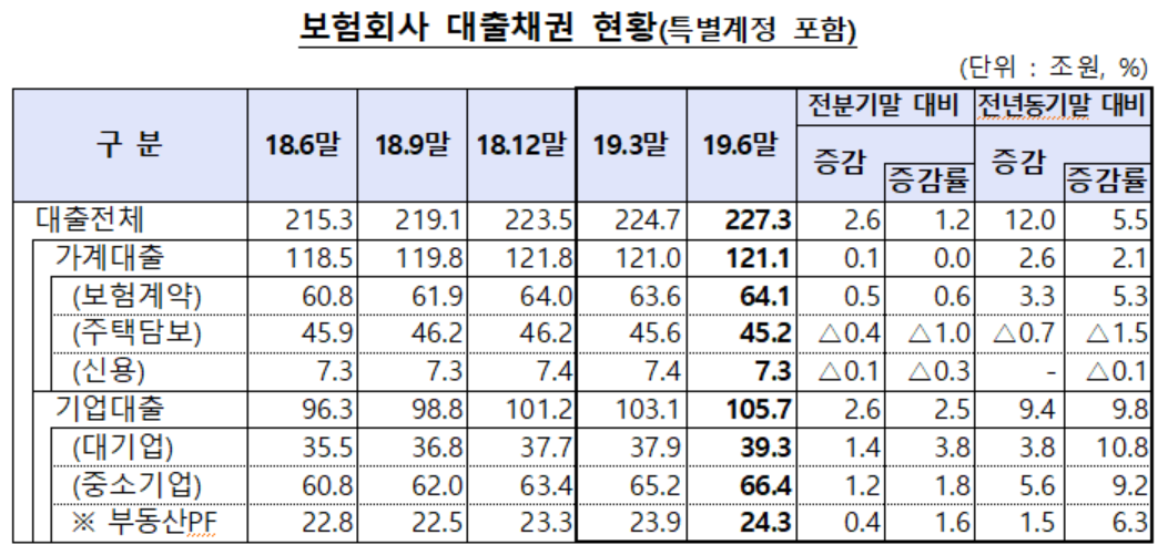 5일 금융감독원에 따르면 올해 6월 기준 보험사의 대출채권 잔액은 227조3000억 원으로, 전분기말 224조7000억 원 대비 2조6000억 원(1.2%) 증가했다.