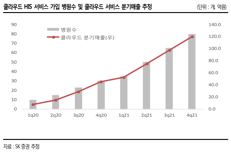 서 연구원은 “국내 약 800여개 중형병원을 목표로 클라우드 HIS 서비스를 준비하고 있다”며 “약 4 년간의 개발기간이 소요된 클라우드 HIS 서비스는 내년 1월 상용화 예정이며, 타겟 병원수가 약 800여개에 달하는 만큼 향후 성장동력이 될 전망”이라고 내다봤다.