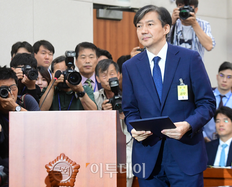 6일 서울 여의도 국회에서 열린 조국 법무부 장관 후보자 인사청문회에서 조 후보자가 선서를 마치고 이동하고 있다. 고이란 기자 photoeran@
