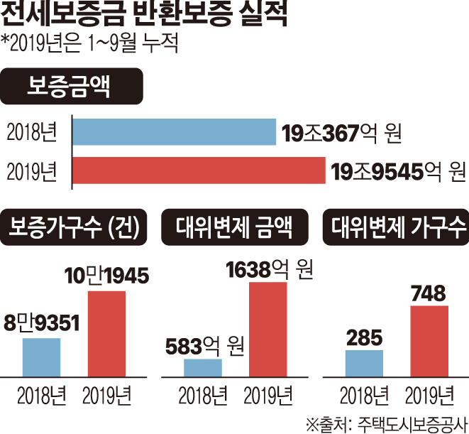 주택도시보증공사(HUG)에 따르면 올해 들어 지난달 말까지 전세보증금 반환보증 발급 건수는 총 10만1945건으로 10만 건을 웃돌았다. 보증 금액도 19조9545억 원으로 20조 원에 육박한다. 작년 한 해 보증금액(19조367억 원), 보증 가구(8만9351가구)를 넘어선 수치다.