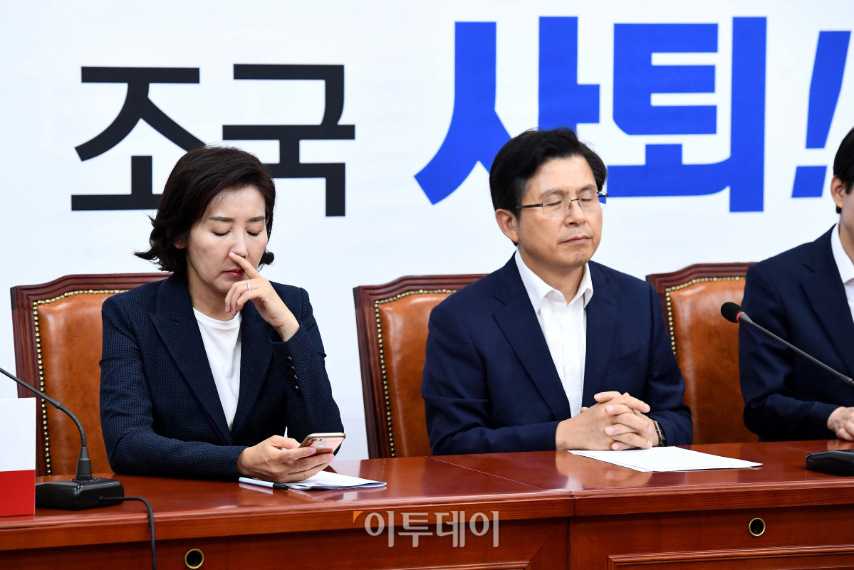 황교안(오른쪽) 자유한국당 대표와 나경원 원내대표가 8일 서울 여의도 국회에서 열린 조국 법무부 장관 후보자 관련 긴급 최고위원회의에서 잠시 눈을 감고 생각에 잠겨있다.