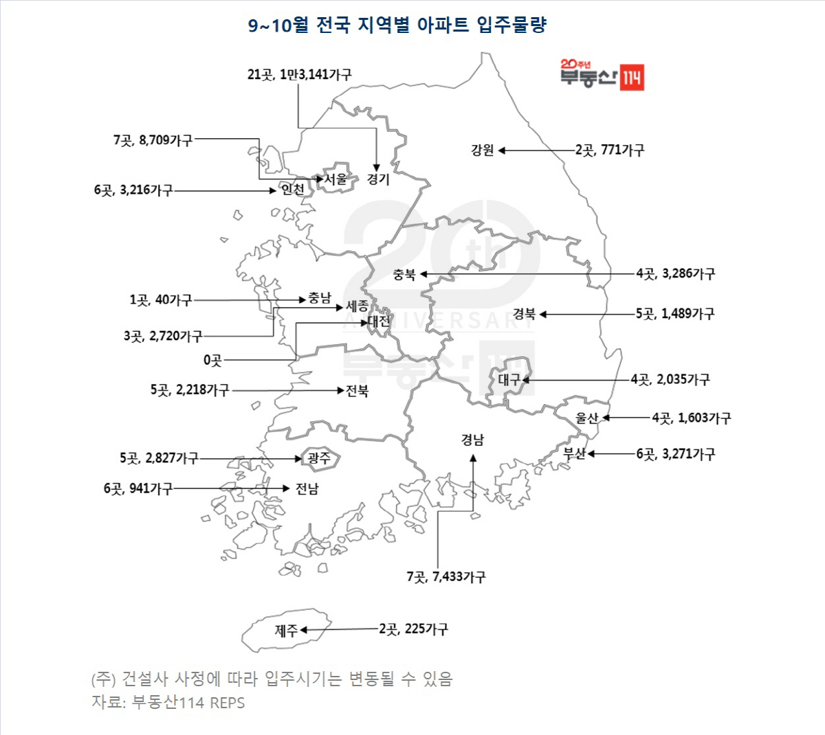 9일 부동산114에 따르면 9ㆍ10월 전국 아파트의 입주 물량은 88개 단지, 총 5만3925가구로 조사됐다. 이는 전년 동기(6만7958가구) 대비 1만4033가구(20.6%) 감소한 수준이다.