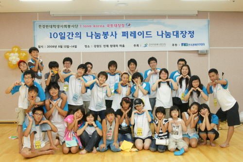 사진은 지난 12일부터 봉사단원이 농촌봉사활동으로 강원도 인제 원대리 마을을 방문해 마을 주민들을 위해 공부방 학습 지원, 환경정화활동 등을 펼치고 아이들이 함께 게임을 하며 환하게 웃고 있다.