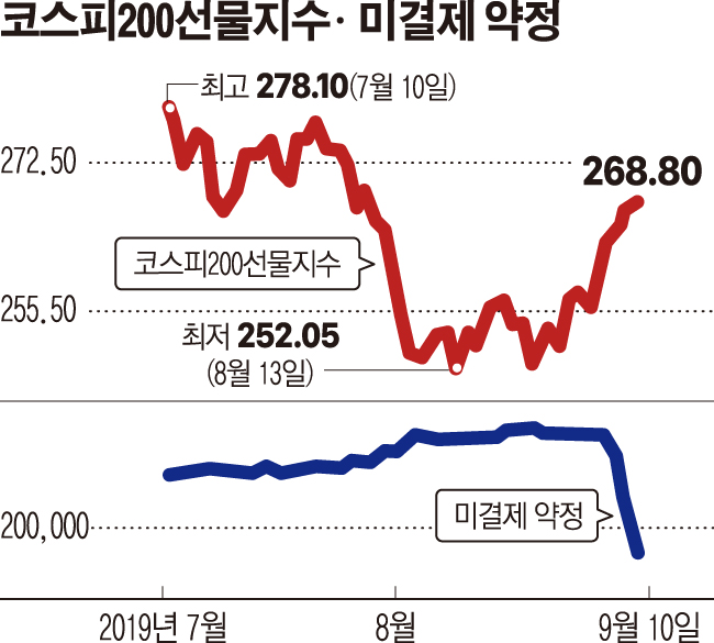 10일 금융투자업계에 따르면 코스피200선물 미결제 약정은 이달 초 35만4957계약에서 15만6699계약으로 크게 감소했다. 같은 기간 코스피200선물지수는 259.35에서 268.80으로 상승했다. 만기일(11일)이 다가오면서 투자자들이 적극적인 매수에 나선 것으로 풀이된다.