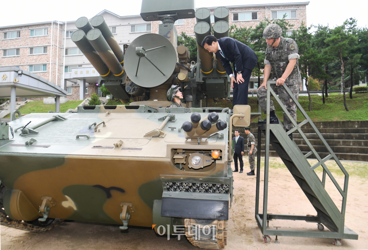 바른미래당 손학규 대표가 10일 경기 김포시 제505방공대대를 찾아 천마(단거리 지대공 유도무기)를 운용하고 있는 병사와 대화하고 있다.