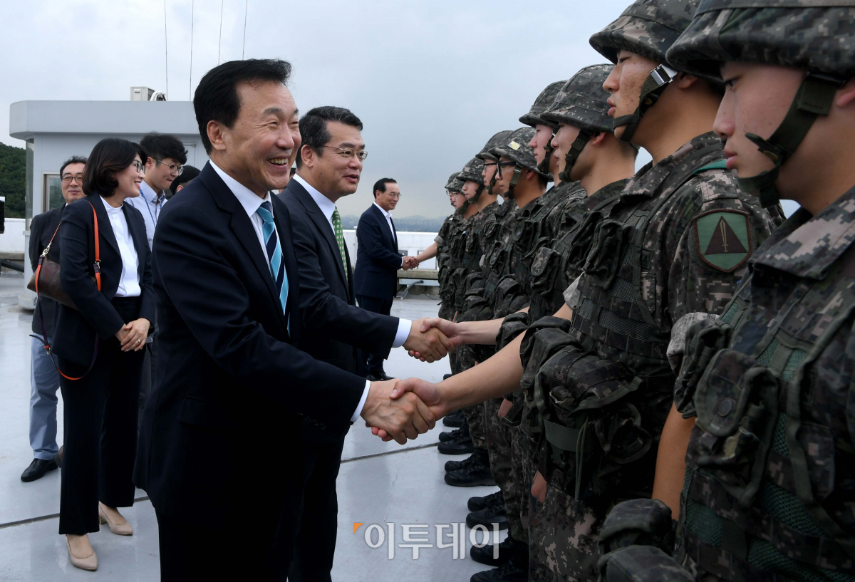 손학규 바른미래당 대표가 10일 서울 강서구 수방사 1방공여단 방공진지를 찾아 장병들과 악수하고 있다.