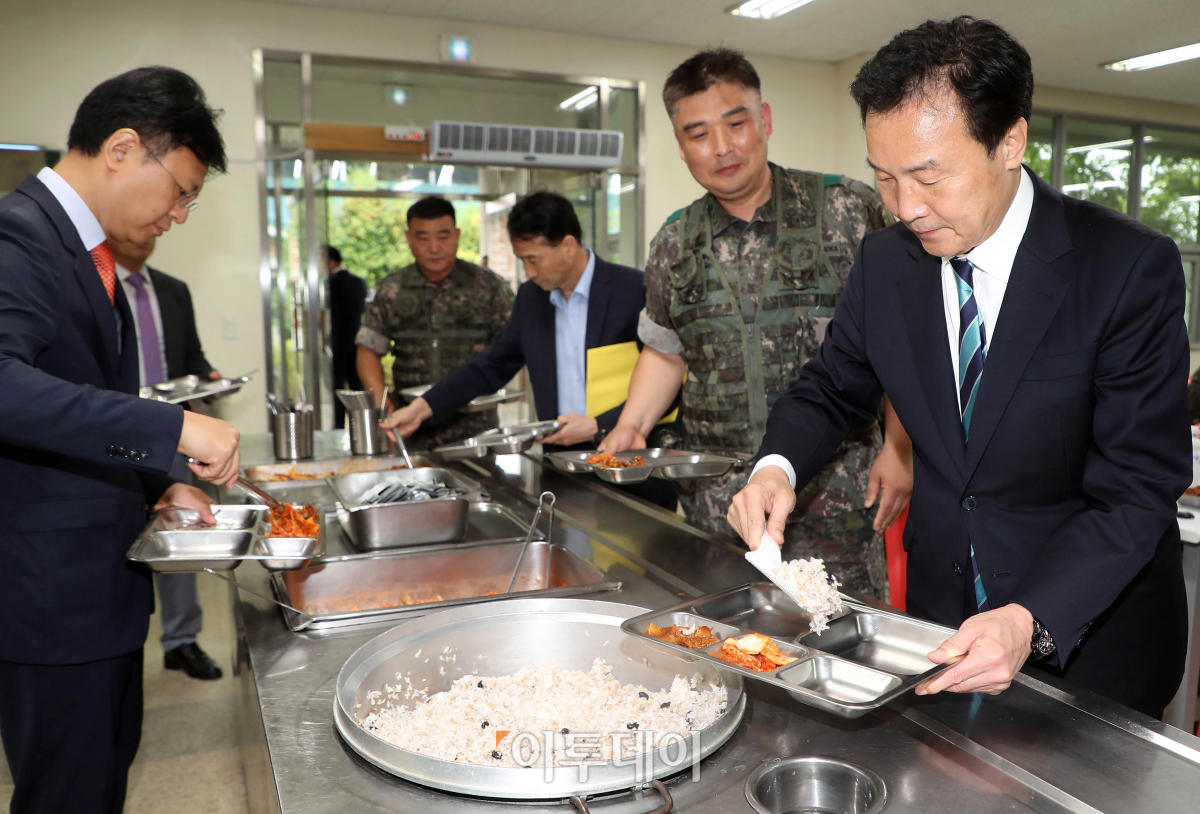 바른미래당 손학규 대표 등 지도부가 추석을 앞두고 경기 김포시 제505방공대대 장병들을 격려했다. 손 대표가 장병들과 점심식사를 하기 위해 식판에 밥을 담고 있다.