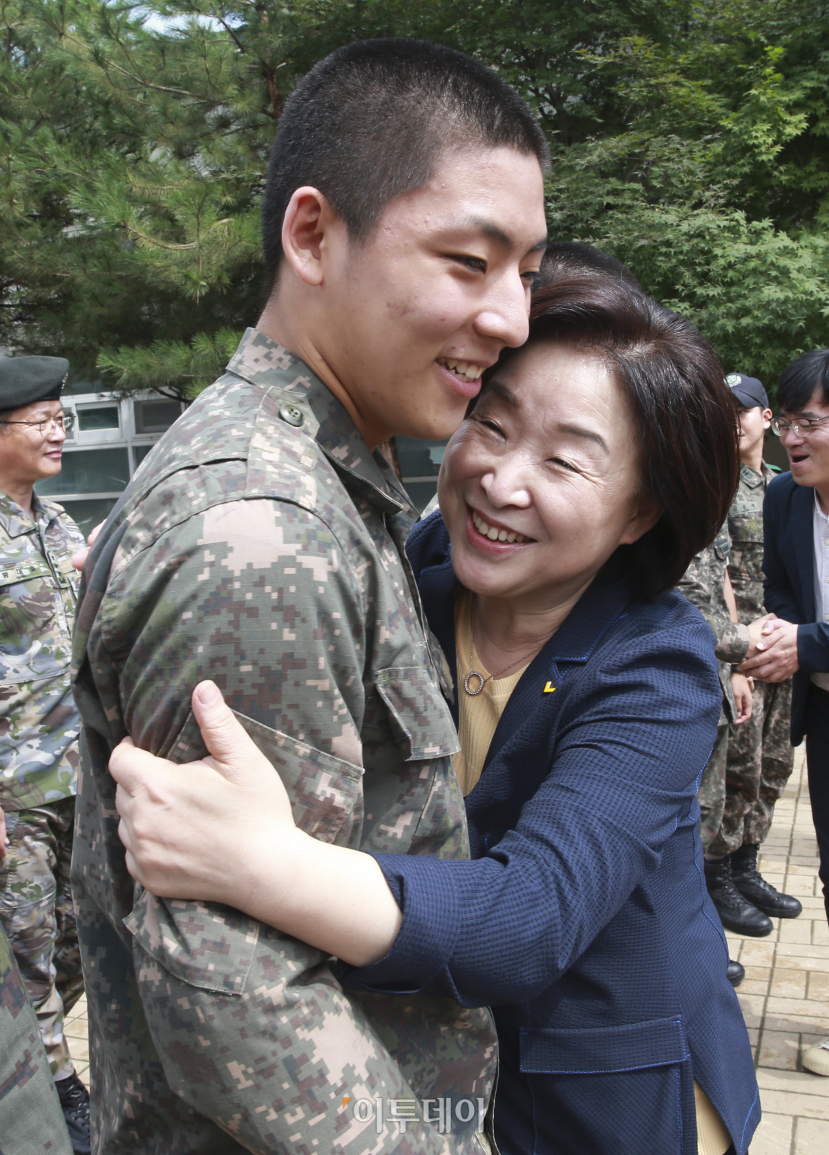 심상정 정의당 대표가 10일 오전 경기도 양주시 남면에 위치한 25사단 신병교육대에서 훈련병과 포옹을 하고 있다. 국회사진취재단