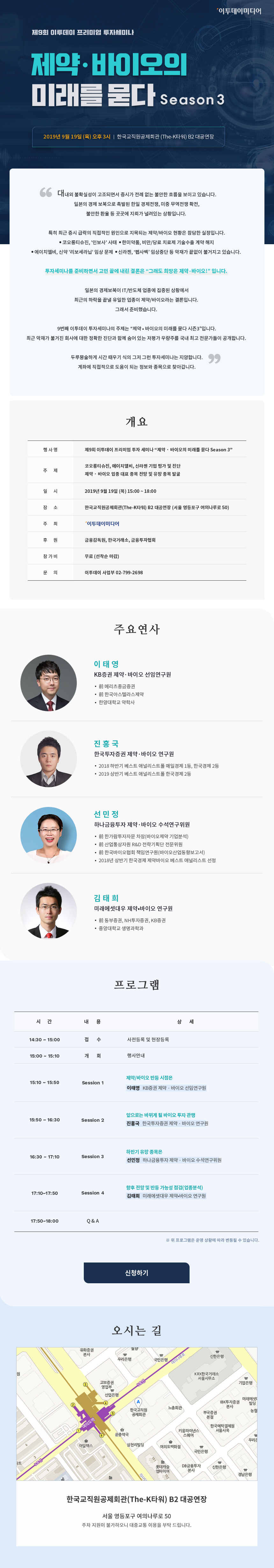 이투데이 미디어가 개최하는 9회 이투데이 프리미엄 투자 세미나 ‘제약ㆍ바이오의 미래를 묻다 시즌3’가 오는 19일 오후 3시 한국교직원공제회관(THE-K타워) B2 대공연장에서 열린다.