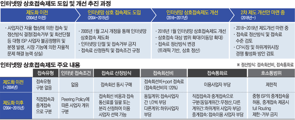 상호접속고시가 개선되기 전인 2016년 이전 KT는 네이버로부터 망 사용료를 받고 SK브로드밴드는 가입자로부터 망 사용료를 받았다. KT와 SK브로드밴드 간 연결된 망에 대한 이용료는 서로 주고받은 트래픽 양이 비슷하다보니 ‘망 이용료를 주고받지 말자’는 무정산 방식이다.
