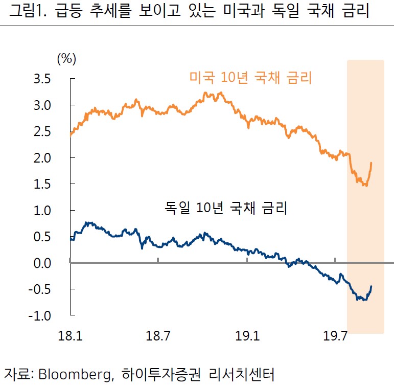 김상현 하이투자증권 연구원은 16일 “미국 10년물 국채 금리가 13일 종가 기준으로 1.8958%까지 상승했다”며 “독일 10년물 국채 금리 역시 –0.449%까지 반등하며 전점 대비 약 0.27%p 상승했다”고 말했다.